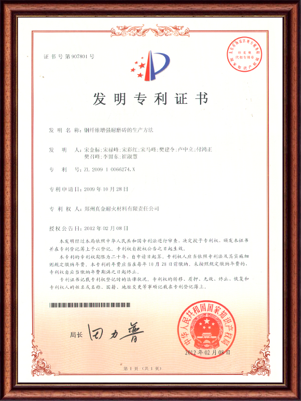 | ZL 2009 1 0066274.X | 鋼纖維增強(qiáng)耐磨磚的生成方法 | 發(fā)明專利證書 |