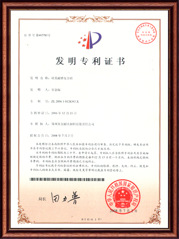 | ZL 2006 1 012X393X X | 硅莫耐磨復(fù)合磚 | 發(fā)明專利證書 |