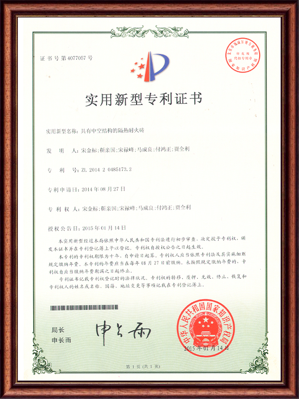 | ZL 2014 2 0485173.2 | 具有中空結(jié)構(gòu)的隔熱耐火磚 | 實(shí)用新型專利證書 |