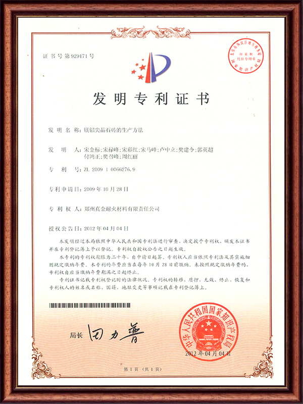 | ZL 2009 1 0056276.9 | 鎂鋁尖晶石磚的生產(chǎn)方法 | 發(fā)明專利證書 |