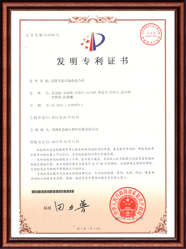 | ZL 2012 1 0183879.9 | 鎂鐵尖晶石隔熱復(fù)合磚 | 發(fā)明專利證書 |