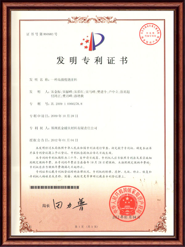 | ZL 2009 1 0066278.8 | 一種高強(qiáng)度澆注料 | 發(fā)明專利證書 |